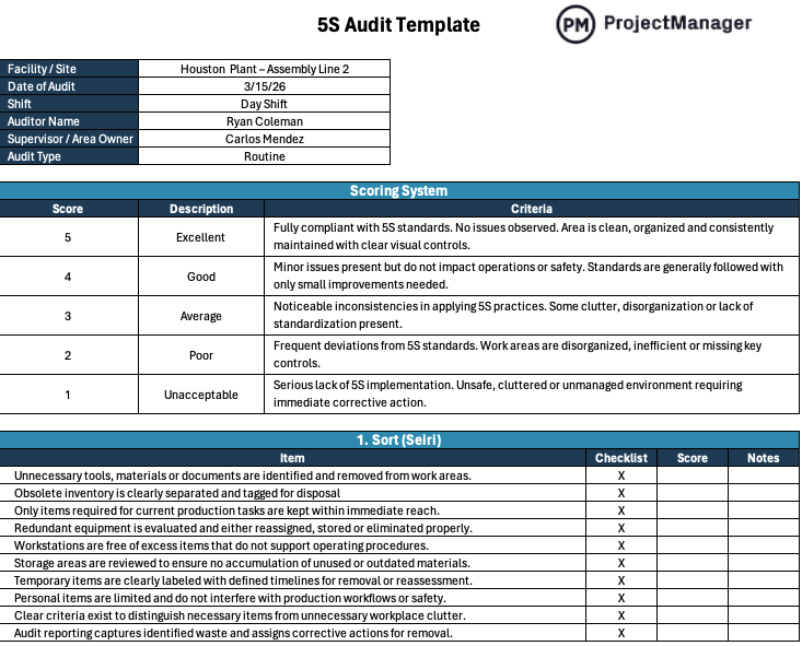 Now it’s time to move from concepts into execution. A 5S checklist breaks down exactly what needs to be reviewed during a 5S audit, giving teams a practical manufacturing checklist to assess conditions, identify gaps and document findings through structured audit reporting.
