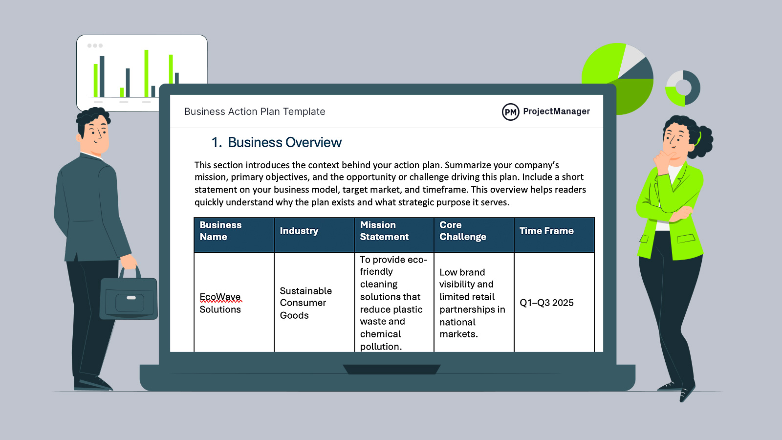 A business action plan template provides clarity, accountability and focus across teams. It defines specific actions, assigns ownership and establishes deadlines so that no task falls through the cracks. This structure turns ideas into actionable steps that keep teams on track and aligned with company goals. It’s an essential tool for ensuring consistent progress toward measurable outcomes.